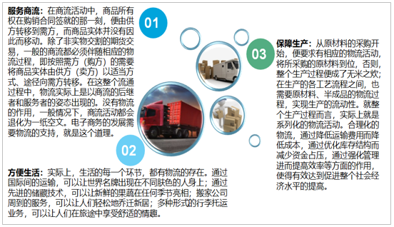 關(guān)于物流的作用,概要的說(shuō),包括服務(wù)商流、保障生產(chǎn)和方便生活三個(gè)方面。